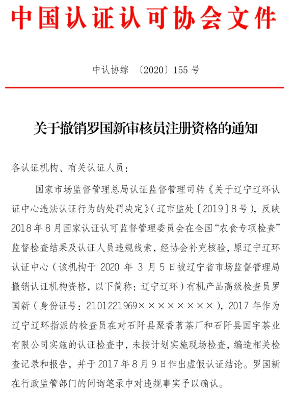 近日,中国认证认可协会发布通知,决定撤销罗国新有机产品认证检查员注册资格(证书号:2020-P2OP-3032438)。5 年内不予受理其所有领域注册申请。详情如下:
